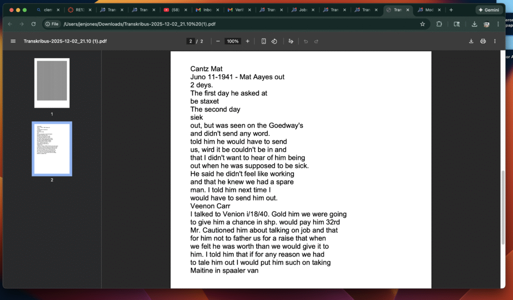 One of my first observations was that the software performed much better with typed or printed materials than with handwritten ones. When I uploaded a printed page, the transcription was nearly flawless, and the tool neatly separated the text into manageable sections. This alone is useful, since it makes digitized documents easier to read and annotate. However, when I tried the handwritten incident reports from Clifford Mill, the results were more uneven. The AI struggled with the flourishes and idiosyncrasies of the cursive script, often misreading words or leaving gaps.