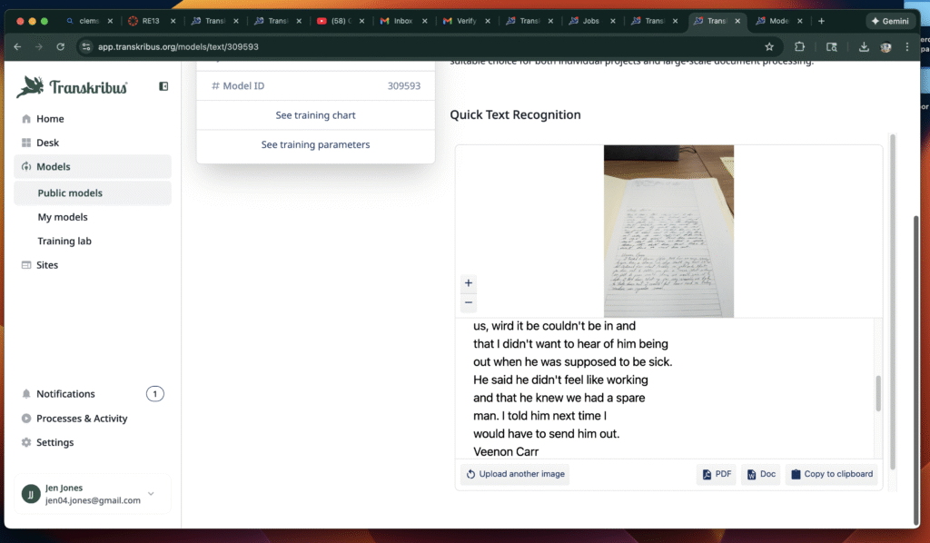 Another feature I found helpful was the way Transkribus split documents into sections, making them easier to navigate. Even when the handwriting recognition was imperfect, the segmentation helped me focus on smaller portions of text. I also experimented with uploading screenshots of both printed and handwritten materials, which gave me a clear sense of the tool’s strengths and limitations.