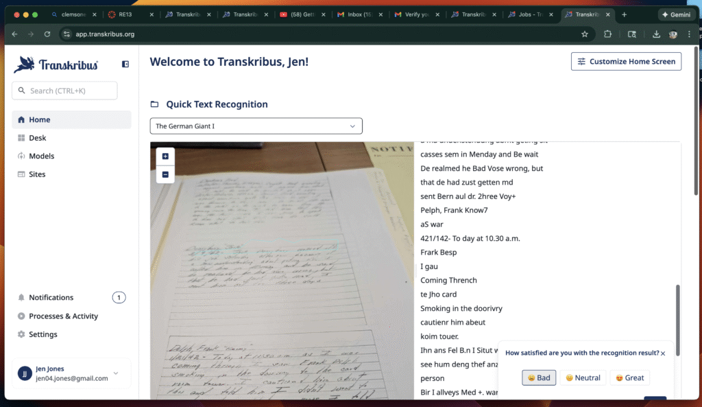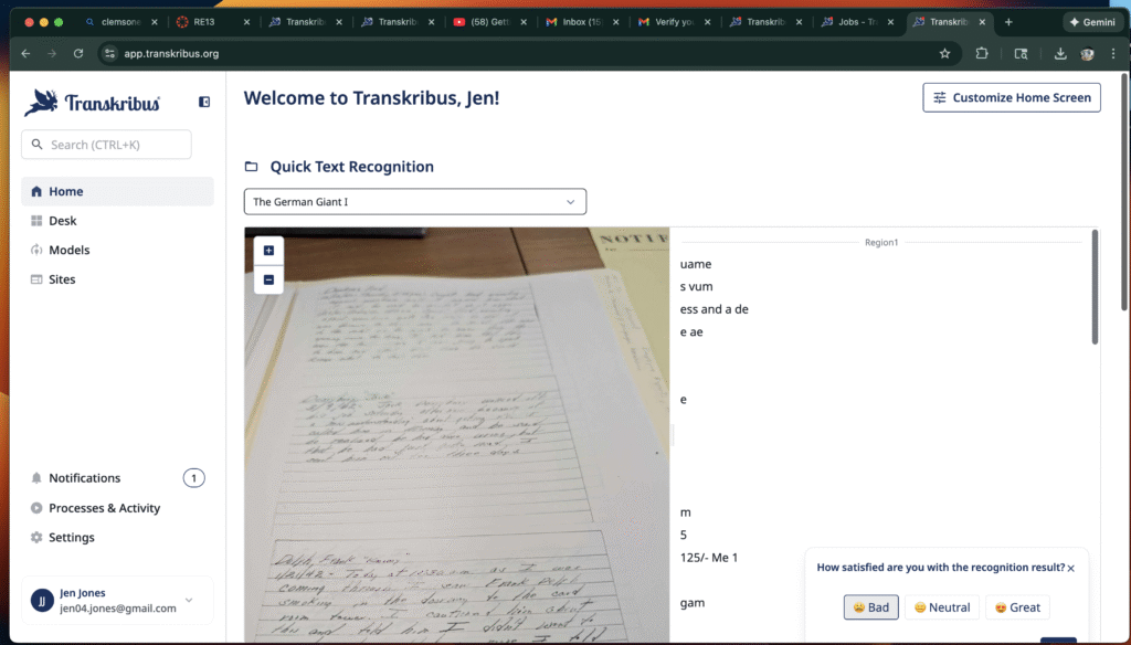 The setup process was straightforward. After creating an account and selecting “Academic Research,” “Just Me,” and “A Small Collection,” I named my project and entered the workspace Transkribus calls “My Desk.” The interface was clean and intuitive, and I appreciated that the tutorials were short and accessible. Within minutes, I was uploading sample documents and testing the recognition features.